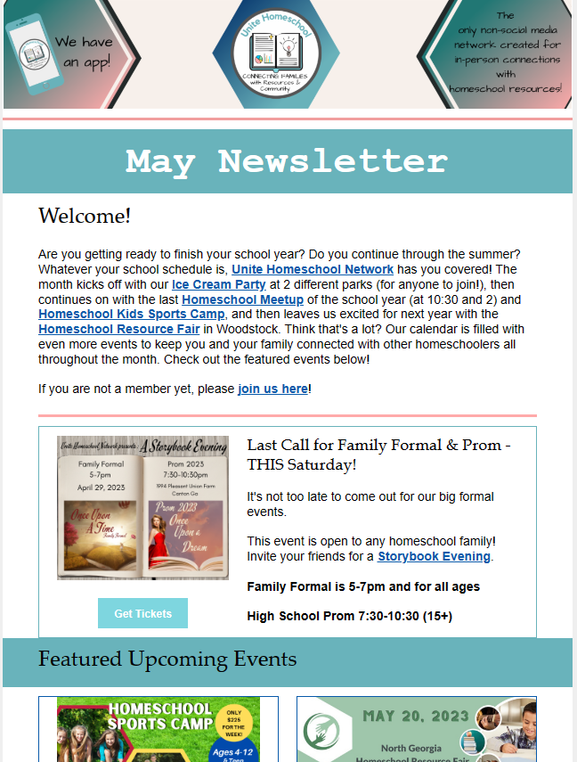 May 2023 Newsletter Apr 27 Written By Angela Pilcher Click the image to read the full newsletter. #UniteHomeschoolHomeschool eventshomeschool support Angela Pilcher